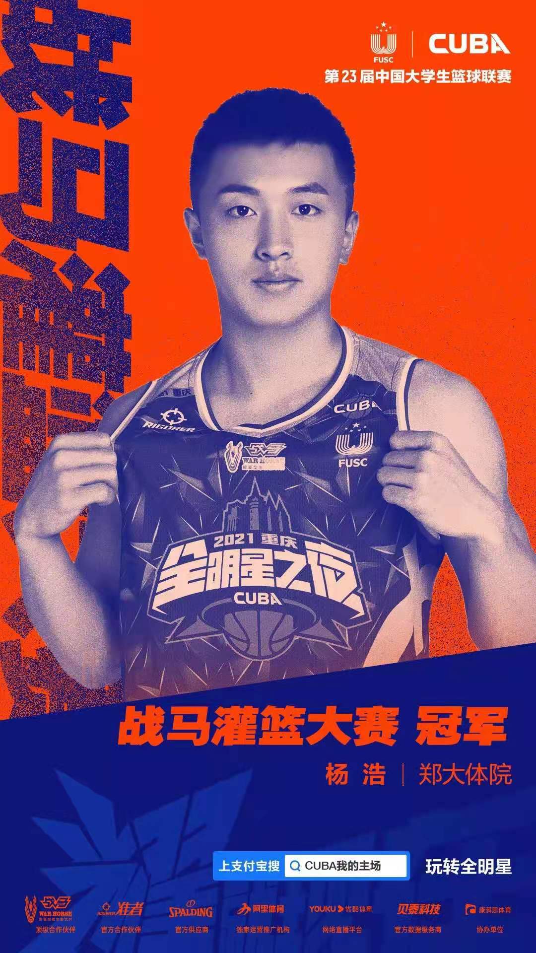 楊浩是河南省唯一一名參加中國大學生籃球聯賽全明星賽的大學生,也是全國唯一一名參加該項賽事的體育類院校的大學生。他以驚人的彈跳和越過五人雙手扣籃的高難度動作,征服了現場的評委和觀眾。
