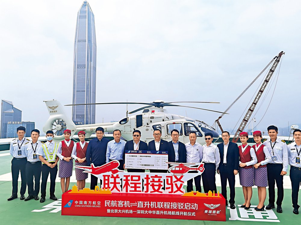 (大公報綜合報道)內地首條「民航客運+直升機」一站式聯運「空中的士」開行,10分鐘無縫換乘機場與市中心。3月18日,由南方航空與東部通航聯合推出的北京大興機場─深圳大中華直升機場接駁航線正式開航,乘客從北京抵達深圳機場後,專車接駁換乘直升機最快10分鐘即可抵達福田CBD。首航乘客肖先生落機後直言,「太省時了,原本2小時的路程,縮短時間近4倍,商務出行非常便捷。」該線通航後將進入常態化運營,票價經補貼後也將降至千元左右,未來還將實現代碼共享、一票雙飛等聯程服務,加速構建三大經濟圈快速空中交通網絡。