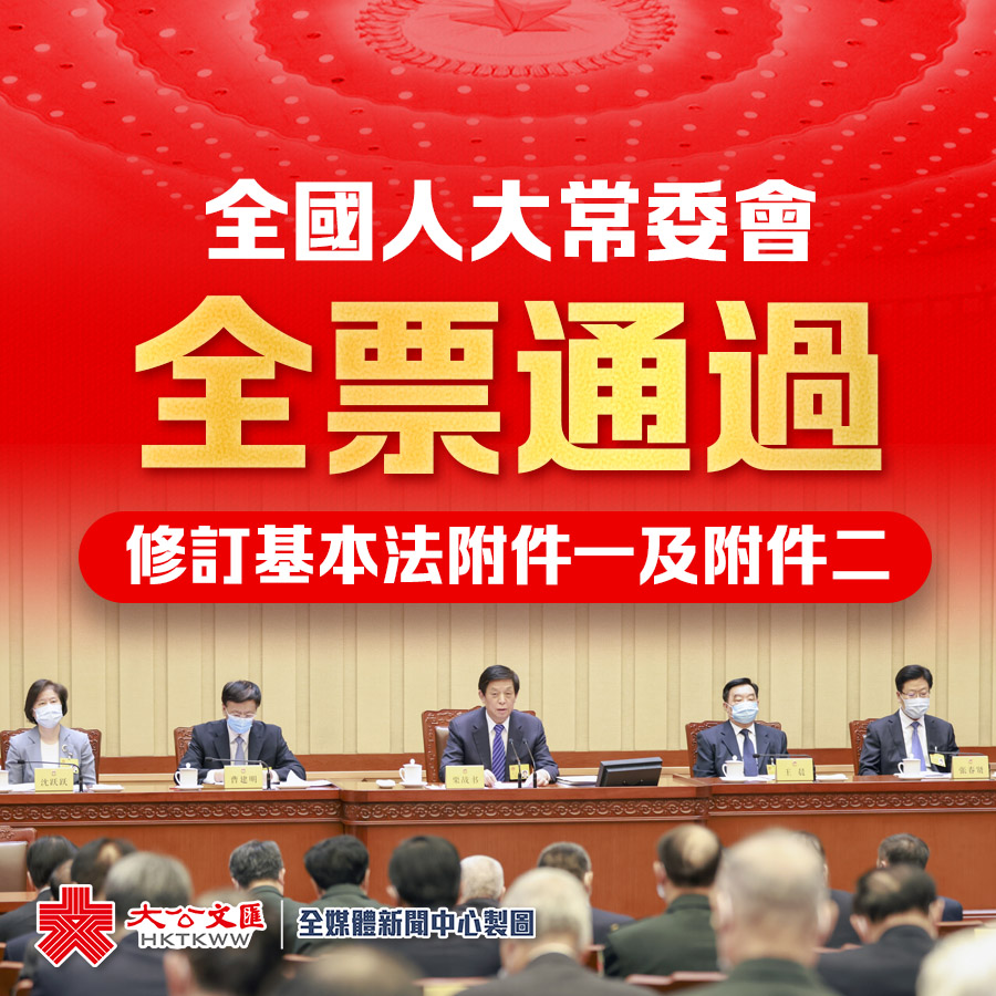 大公文匯全媒體報道:十三屆全國人大常委會第二十七次會議今日(30日)上午在北京人民大會堂閉幕。會議經表決,全票通過新修訂的《中華人民共和國香港特別行政區基本法附件一香港特別行政區行政長官的產生辦法》、新修訂的《中華人民共和國香港特別行政區基本法附件二香港特別行政區立法會的產生辦法和表決程序》。