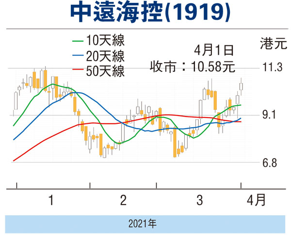 集團業績優於市場預期,即獲大摩加入唱好行列,預料該股未來30天股價有七八成機率上升給予「增持」評級看11.88元(港元,下同),即較現價有約12.3%的上升空間,以反映蘇伊士運河封航帶來運力干擾導致運費率反彈,料將為股價帶來正面催化。就估值而言,中遠海控往績市盈率約11倍,市賬率3.28倍,尚處於合理水平。若股價短期升穿52周高位的11.44元,下一個目標將上移至13元,宜以失守10元支持則止蝕。