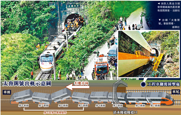 (記者 蔣煌基 福建報道)台鐵408車次太魯閣號2日在花蓮縣行駛期間發生嚴重出軌事故。直至截稿前,已造成50死146傷,仍有數十人受困。有生還者表示,列車附近到處都是屍體,台當局正急徵屍袋。台鐵局事後通報稱,事故原因疑是停在工地斜坡上的工程車未拉手剎,突然滑落,撞上列車所致。袁姓列車司機和助理司機不幸身亡,前者遺下新婚妻子,列車長亦受傷。此次是當地半世紀來最嚴重的鐵路事故,台鐵稱不排除向施工廠商求償。