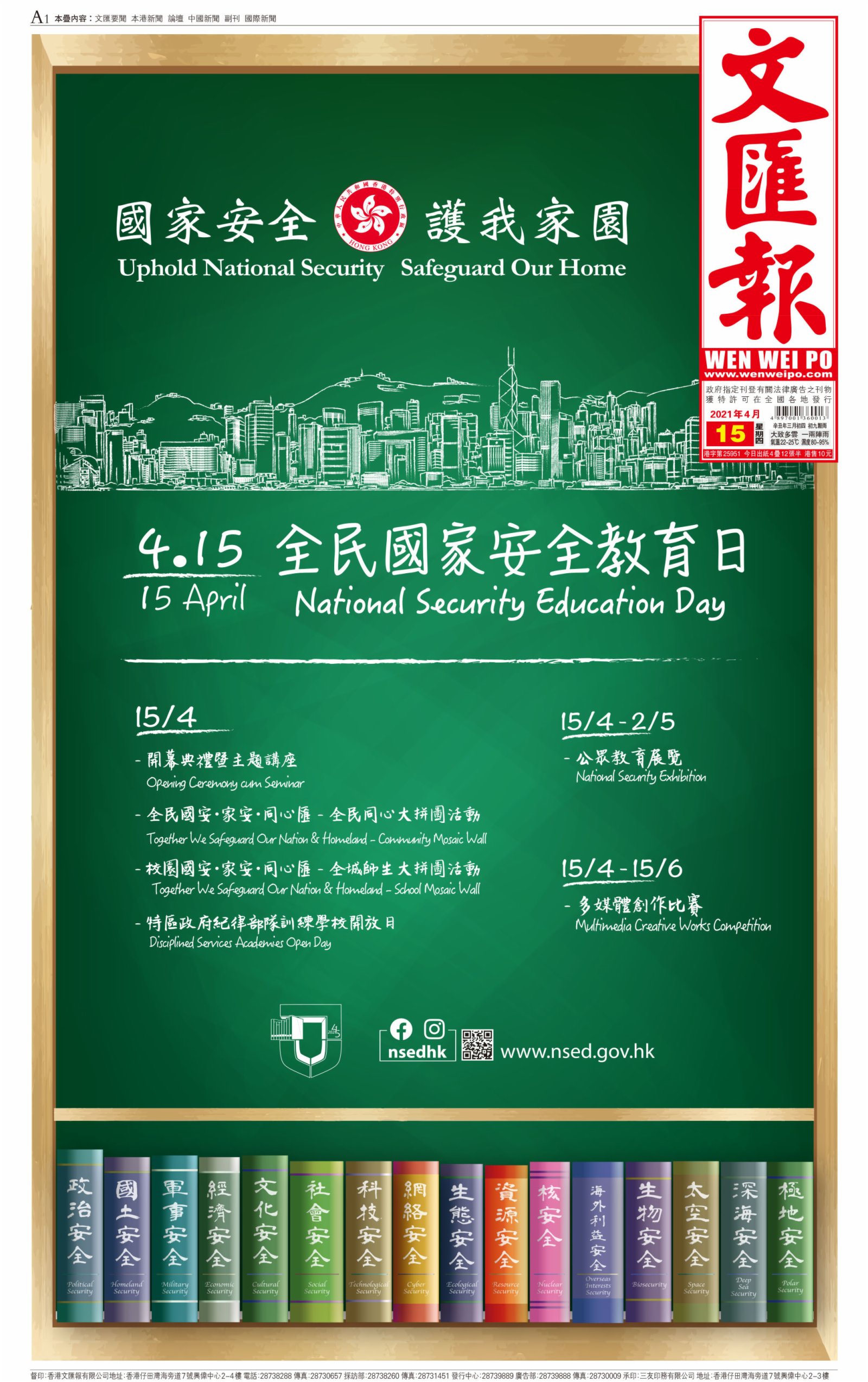 特區政府早前已開辦「全民國家安全教育日」fb專頁,讓市民認識總體國家安全觀及其豐富的內涵,以及香港國安法對維護國家安全、完善香港特區國家安全體系,進一步完善選舉制度, 落實愛國者治港方面的重要性,定於4月15日至5月2日在中環愛丁堡廣場3號展城館舉辦國家安全公眾教育展覽。同時,還將舉辦鼓勵全港市民積極參與互動的全民同心大拼圖活動、全城師生大拼圖活動、特區政府紀律部隊訓練學校開放日、國家安全多媒體創作比賽等大型活動。