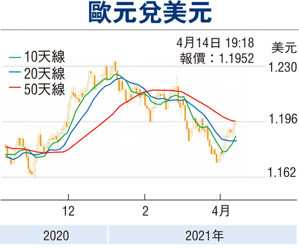 另一方面,美國10年期長債息率近期持續高企之際,歐元過去1周卻大部分時間處於1.1860至1.1930美元之間的活動範圍,未有遭遇太大下行壓力,顯示踏入4月份,歐元走勢開始有上移傾向,有望逐漸收復3月份的所有跌幅。雖然美國周二公布3月份消費者物價指數按月攀升0.6%,為8年多以來的高點,而按年的2.6%升幅亦是逾兩年半的高點,但美國10年期債息同日反而掉頭回落至1.62%水平,歐元輕易向上衝破1.1930美元附近阻力後升幅繼續擴大。此外,歐洲央行行長拉加德與美國聯儲局主席鮑威爾本周三將先後發表談話,若果言論未能扭轉美元指數過去兩周的下行走勢,則不排除歐元將進一步向上挑戰近5周以來位於1.1990至1.2000美元之間的主要阻力區。預料歐元將反覆重上1.2050美元水平。