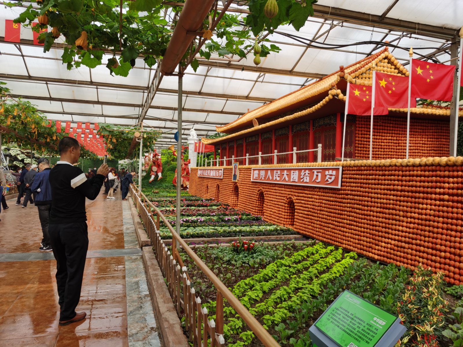 據了解,第22屆菜博會以「綠色·科技·未來」為主題,主展區45萬平方米,室內展覽面積16.5萬平方米,包括12個展館、優質蔬菜品種展示區、蔬菜博物館及廣場展區。其中8號館以慶祝中國共產黨建黨100周年為主題,設置了「百年偉業」「中華圓夢」「中國精神」「盛世歡騰」「清風廉韻」等大型蔬菜景觀,尤其是以玉米、南瓜、蔬菜種子等原材料雕刻粘貼製作而成的天安門和人民大會堂,吸引了眾多遊客駐足留影。