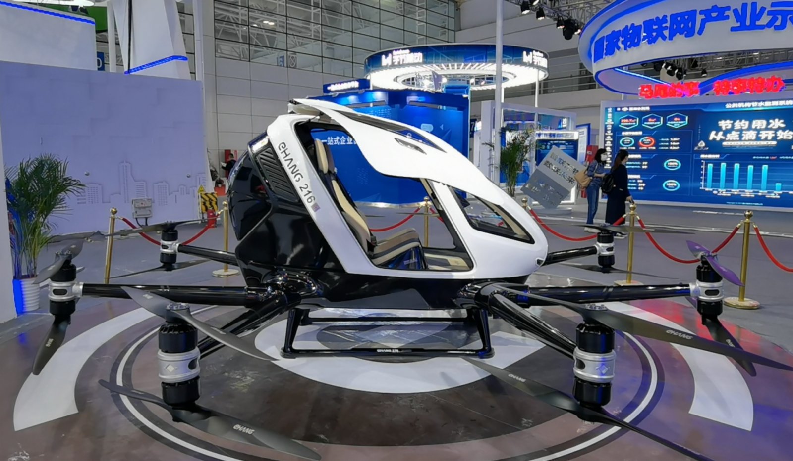展位負責人介紹,和普通小型無人機人為操控不同,載人級自動駕駛飛行器通過智能飛行指揮調度中心,進行集中指揮調度管理。飛行器配備的是先進的算法技術和傳感器,擁有智能導航技術,通過「雲端」實現地空實時信息交互,確保飛行器按照預先設定的飛行路徑,通過GPS精準定位,在經民航部門批准的路線上,完成點對點的精準起降飛行。