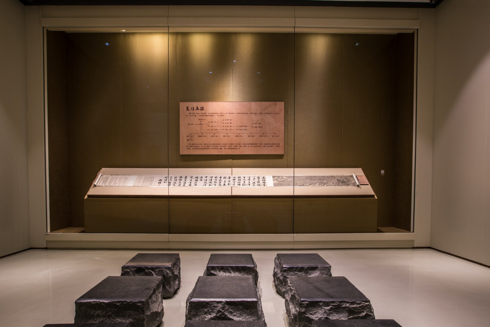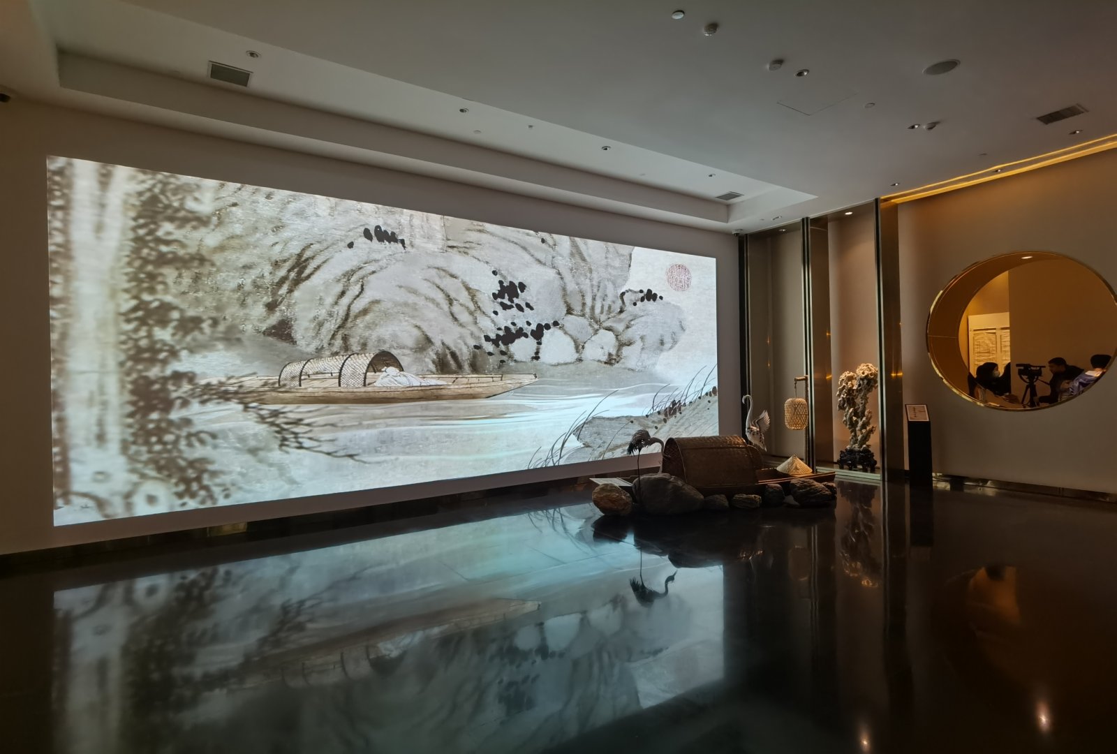 步入展廳,迎面是一個全屏的多媒體活畫視頻,生動還原了趙雍《前浦理綸圖》,再現江南水岸,隱士卧舟,漁翁理綸的田園風光。視頻前方則是以江南的水、舟、禽鳥等元素為主題的造景,呼應書畫創作背景。展覽即以這幅《前浦理綸圖》開篇。趙雍是書法家趙孟頫之子,宋太祖趙匡胤的十二世孫。此畫曾為清初「四王」之一王鑒所藏,張大千留下臨摹作品。