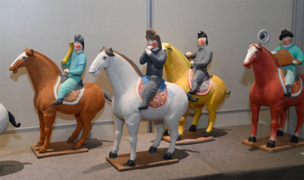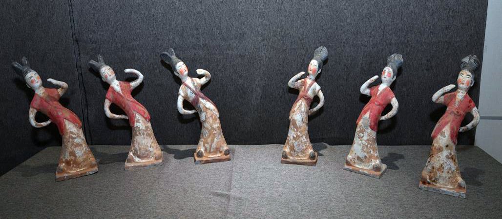今次展覽的90件套、320人偶作品中,有集音樂舞蹈雜耍為一體,熱鬧非凡的漢代雜耍舞俑,動作誇張、活力四射的說書俑;有粗獷豪放的南北朝時期的騎馬吹角俑,華麗多姿、場面壯觀的唐代宴樂舞俑,胡人舞俑,霓裳羽衣舞俑;還有元代表現北方游牧民族生活的胡人騎駝擊鼓俑等。它們熱烈奔放、造型生動、特色鮮明,其迥然不同的藝術風格,表現出不同時代的精神風貌,生動地勾畫出中國古代樂舞在2000多年發展過程中的演進軌跡。