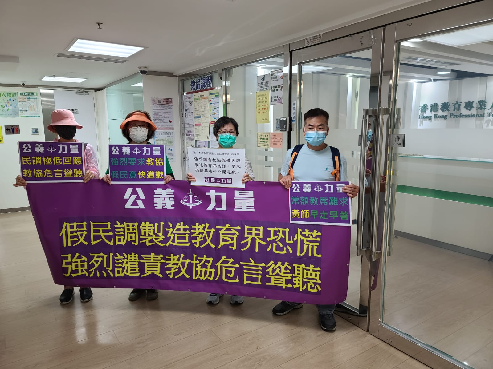 大公文匯全媒體報道:團體「公義力量」4名成員5月11日到香港教育專業人員協會(教協)請願,抗議教協造假民意,惡意製造恐慌,強烈要求教協會會長馮偉華盡快公開道歉。