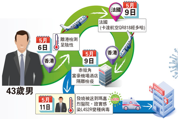 該男患者居於中環士丹頓街29號,上周四到法國,離港的病毒檢測呈陰性,至本周日經多哈搭乘卡達航空QR818航班返港,入住赤鱲角富豪機場酒店隔離檢疫,本周二因發燒被送到瑪嘉烈醫院,檢測證實感染L452R變異的變種病毒,並無N501Y變種病毒株。