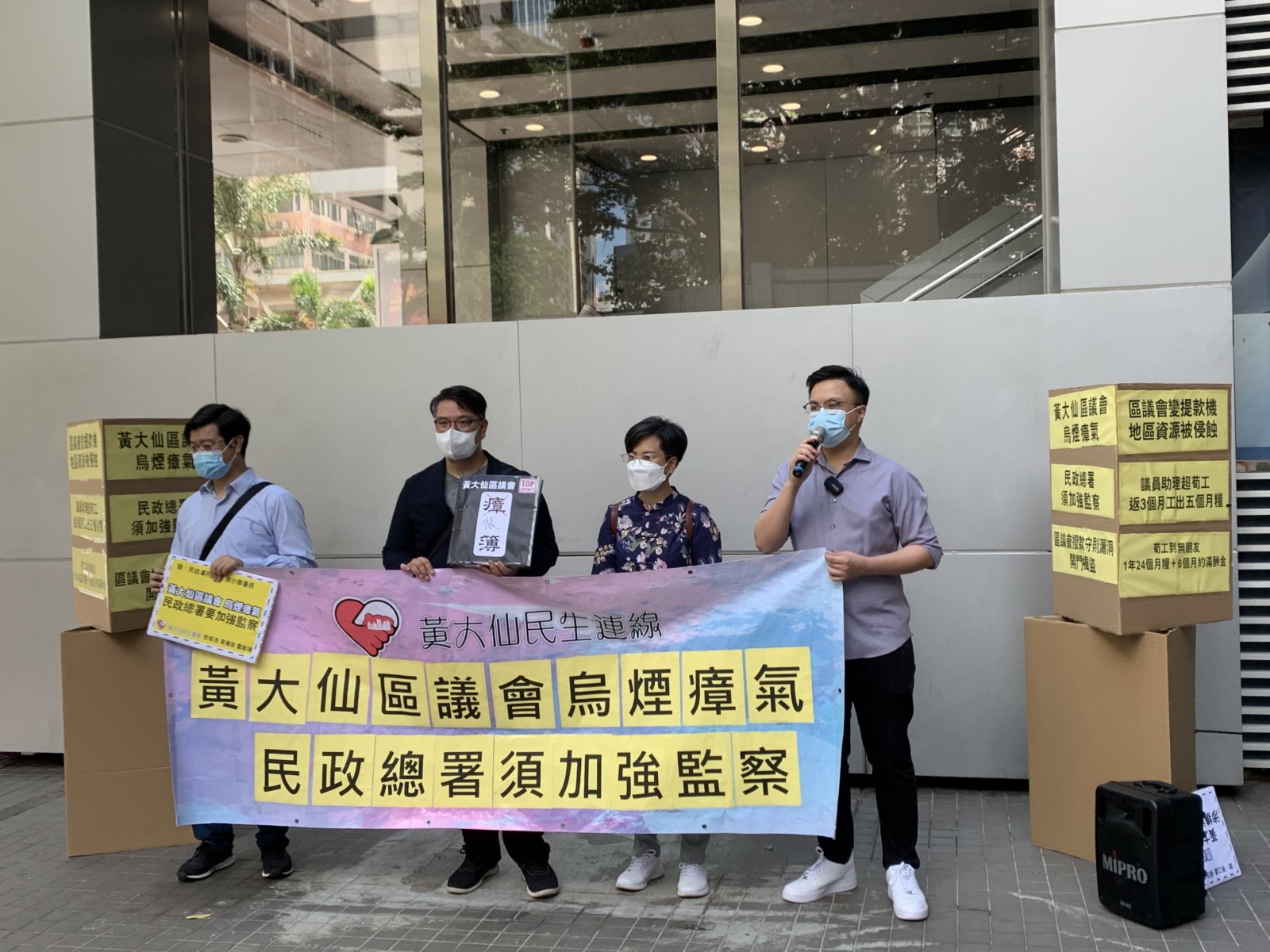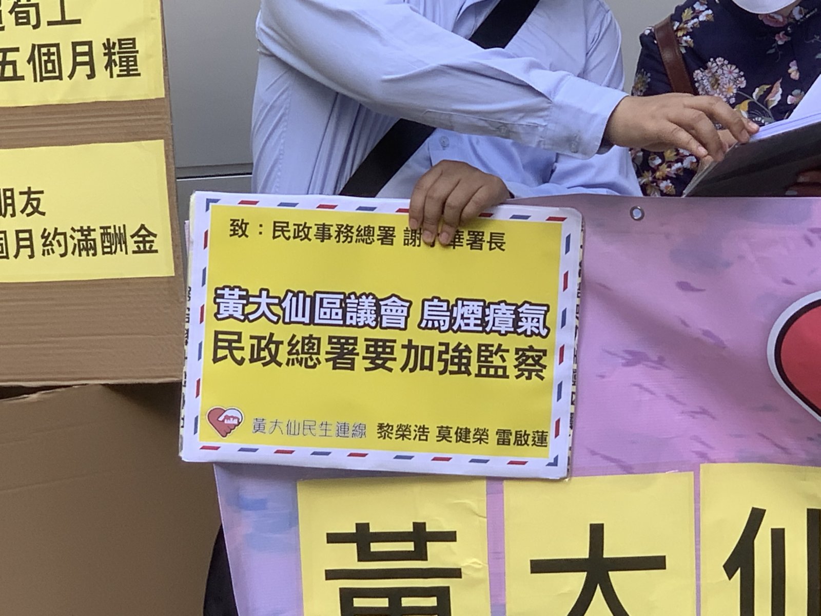 大公文匯全媒體報道:團體「黃大仙民生連線」今早(18日)到民政事務總署及勞工處請願及遞交投訴信,懷疑黃大仙區議會審批撥款情況異常。「黃大仙民生連線」副召集人黎榮浩、莫建榮、雷啟蓮及成員莫嘉傑呼籲民政總署加強檢查。