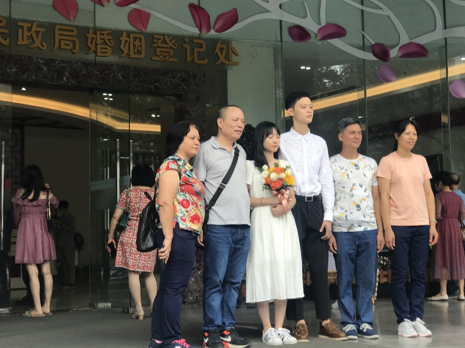 現場很多新人都是全家上陣,共享這一喜慶時刻。新娘子陳女士告訴記者,他們本來年初就要登記結婚的,但因為丈夫外派工作幾個月,沒有來得及辦理,這次趁他休假,兩人決定在廣州登記。「我們雙方父母也都請假過來了,見證我們登記、成家的重要一刻。」