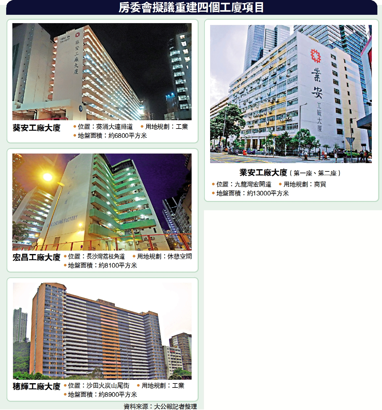 資料顯示,業安工廠大廈有兩座,佔地面積逾13000平方米,是擬議重建工廈中面積最大,預計可提供逾千個單位;宏昌工廠大廈及穗輝工廠大廈同樣佔地逾8000平方米,料可提供數百至一千個單位;葵安工廠大廈則交通方便,距葵興站約五至十分鐘路程,惟屬六個工廈中地盤面積最細,料提供數百個單位。四個地盤可望提供約4000個單位。