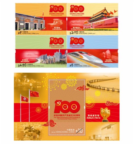 率先隆重登場的是以「中國共產黨成立一百周年」為題的紀念郵票。中國共產黨於1921年7月成立,為慶祝其成立一百周年,香港郵政將以此為題,於7月1日(星期四)發行一套四枚郵票及一張郵票小型張。郵票及郵票小型張引用了中國共產黨成立一百周年慶祝活動的唯一官方指定標識,包括圖案及主題名稱引用於郵票設計內,而標識內之56根光芒線寓意中國共產黨奮進之光照耀中華大地。郵票將光芒線延伸,在紅紅的黨旗飄揚下,串連每一枚郵票,分別展示黨領導新中國的成立和發展,實現為人民謀幸福、為民族謀復興、為世界謀大同的目標。香港在中國共產黨和中央政府的領導下,成功落實「一國兩制」,香港作為特別行政區,得以維持繁榮安定,並融入國家發展的大局。