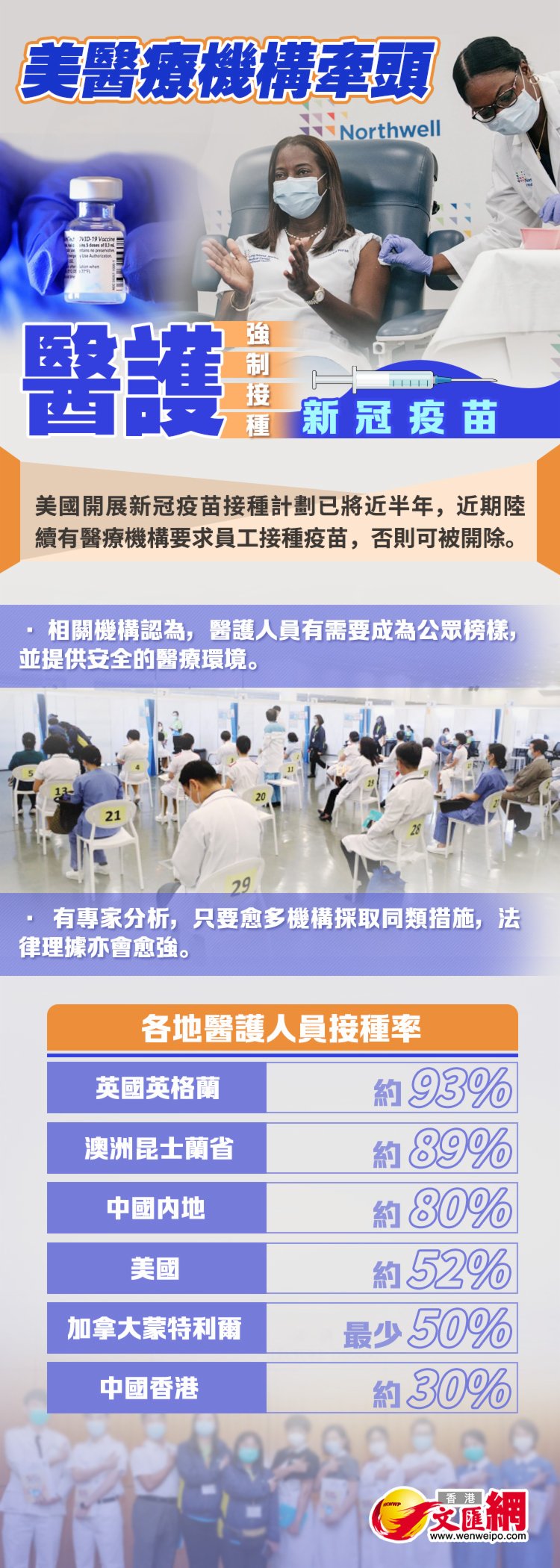 美國醫療網站MedPage Today上周五報道,賓夕法尼亞州大學醫療系統要求所有員工在9月1日前打針,由7月1日起,新員工入職前亦需完成接種,夏季期間則會舉行講座,由專家解答員工對疫苗的疑問。位於新澤西州的RWJBarnabas Health醫療集團,則要求所有主任及管理層在6月30日前打針,院方暫未向其餘員工發強制打針令,不過發言人透露,預料最終亦會向全體員工實施。