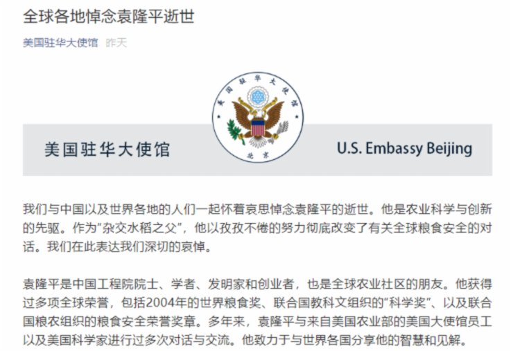 美國駐華大使館官方微信發文,稱「與中國一級世界各地的人們一起懷念哀思悼念袁隆平的逝世」,並表示「深切哀悼」。