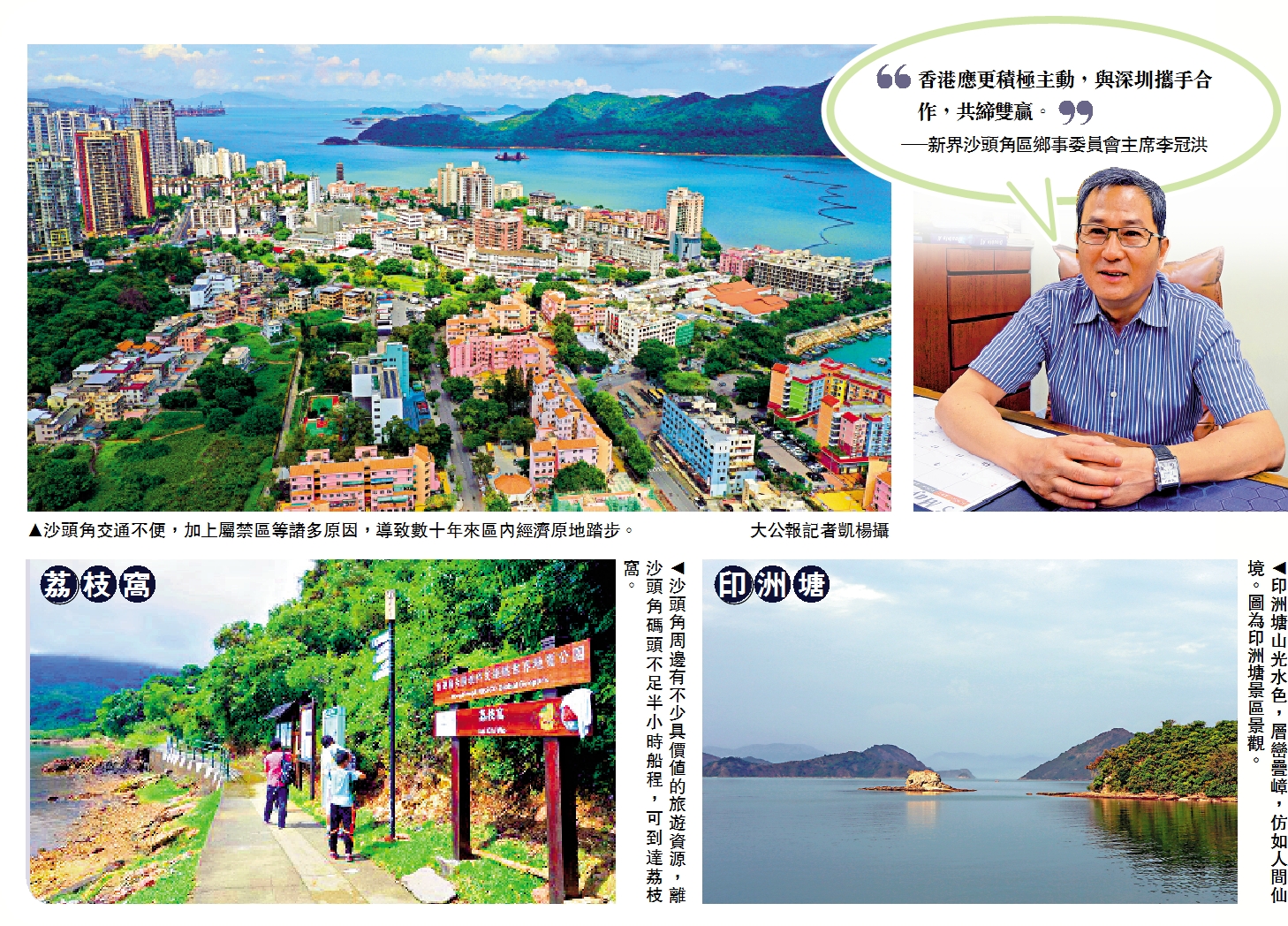 (大公報記者 黃山、盛德文)立法會近期通過「以口岸經濟帶動新界北發展」議案,社會各界愈來愈多人認識到,港深雙城共同發展,機遇無限。新界沙頭角區鄉事委員會主席李冠洪接受大公報記者專訪,倡議沙頭角解「禁」,利用沙頭角碼頭激活周邊旅遊資源,配合對岸鹽田區政府規劃的深港國際旅遊消費合作區的藍圖,大力發展深度生態遊。李冠洪更出謀獻策,建議興建連接船灣和馬鞍山的跨海大橋,打通交通命脈,令沙頭角展生機。