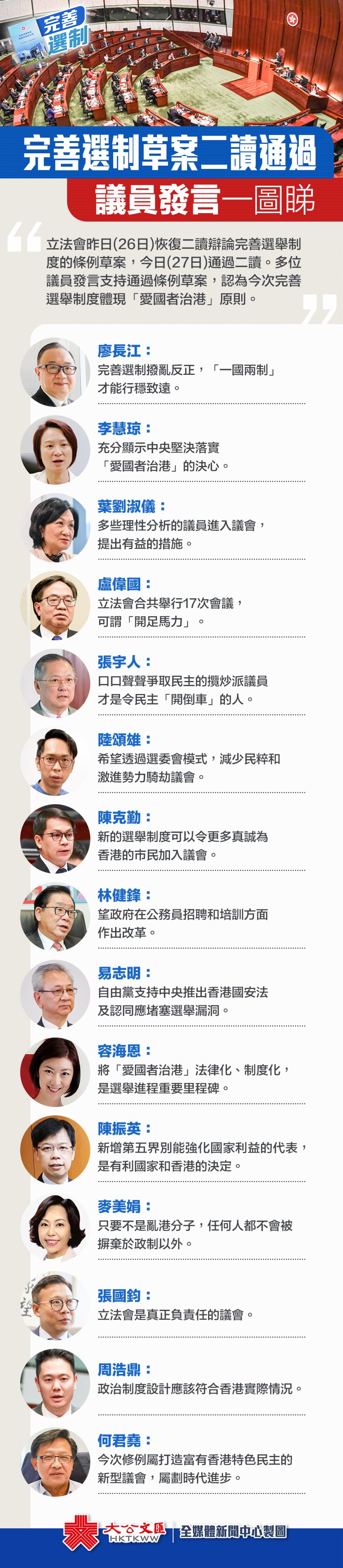 大公文匯全媒體報道:立法會昨日(26日)恢復二讀辯論完善選舉制度的條例草案,今日(27日)通過二讀。多位議員發言支持通過條例草案,認為今次完善選舉制度體現「愛國者治港」原則。