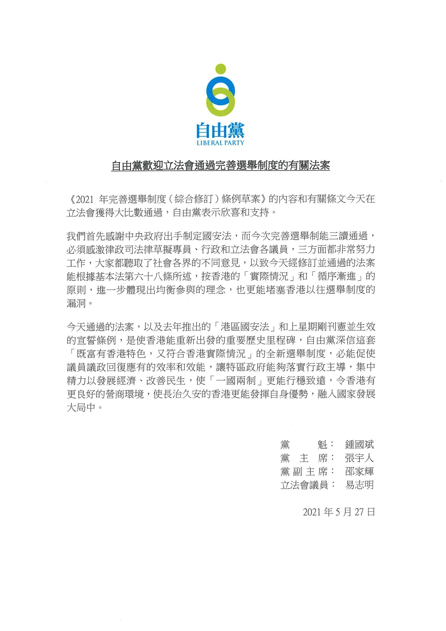 自由黨首先感謝中央政府出手制定國安法,而今次完善選舉制能三讀通過,必須感激律政司法律草擬專員、行政和立法會各議員,三方面都非常努力工作,大家都聽取了社會各界的不同意見,以致今天經修訂並通過的法案能根據基本法第六十八條所述,按香港的「實際情況」和「循序漸進」的原則,進一步體現出均衡參與的理念,也更能堵塞香港以往選舉制度的漏洞。