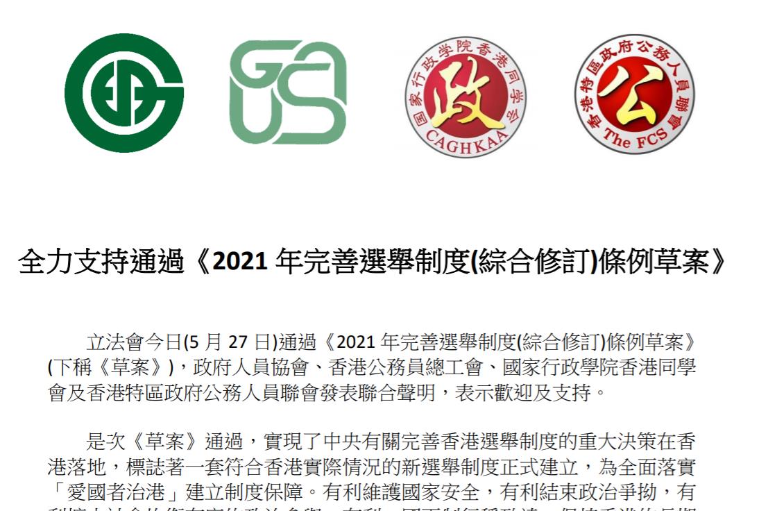 大公文匯全媒體報道:立法會今日(27日)以40票贊成、2票反對,三讀通過完善選舉制度條例草案,標誌着完善香港特區選舉制度的本地立法完成。政府人員協會、香港公務員總工會、國家行政學院香港同學會及香港特區政府公務人員聯會今日下午發表聯合聲明,表示歡迎及支持。