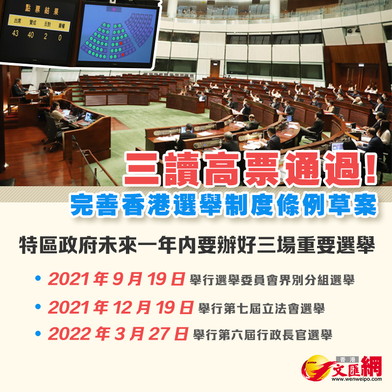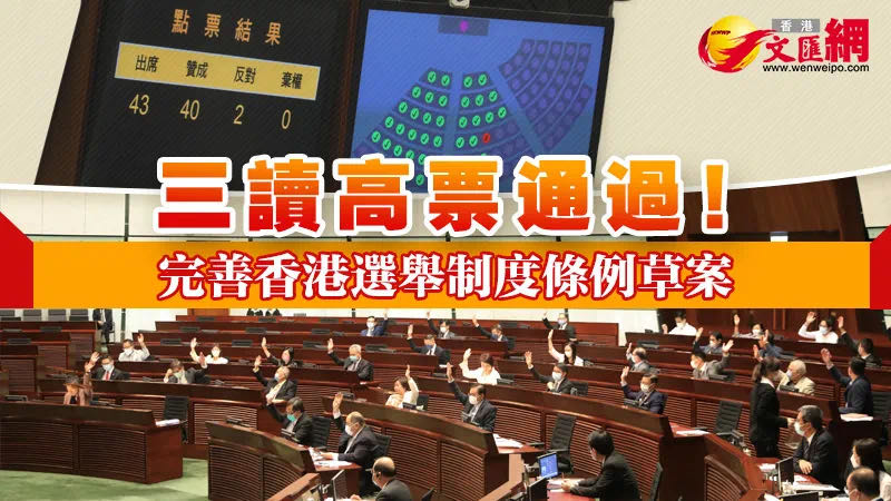 立法會今日(27日)以40票贊成、2票反對,三讀高票通過完善選舉制度條例草案,標誌着完善香港特區選舉制度的本地立法完成。