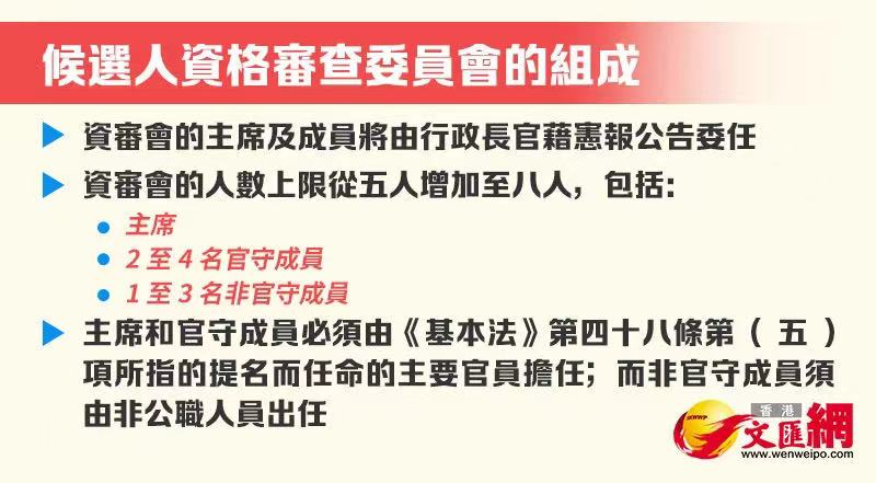 修正案列明,將候選人資格審查委員會成員人數上限由5人增至8人,並規定行政長官除了委任資審委主席及2至4名官守成員外,亦須委任1至3名非官守成員。至於終止立法會選舉程序的要求,修正案訂明立法會選舉候選人在提名期結束後但在選舉投票結束前已去世或喪失資格,有關的選舉程序不會終止。
