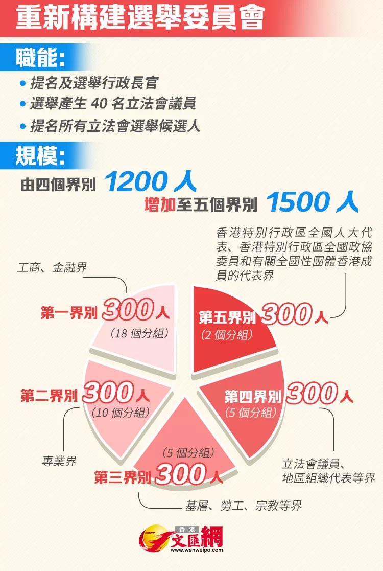 在新選舉制度下,負責提名特首及立法會候選人的選舉委員會將會由1200人增至1500人,分成5個界別,加入地區組織,以及全國性團體香港成員代表;至於117個區議會代表議席全部取消。
