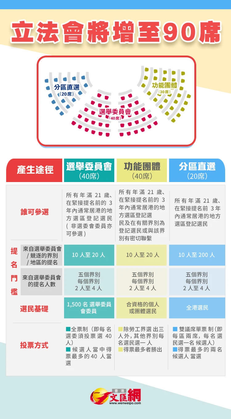 立法會將增至90席,選委會佔最多,有40席,功能組別減至30席,取消「區議會」及「超級區議會」議席,地方直選減至20席。地方直選方面,全港將分為10個選區,每區選出2名議員,採用雙議席單票制。
