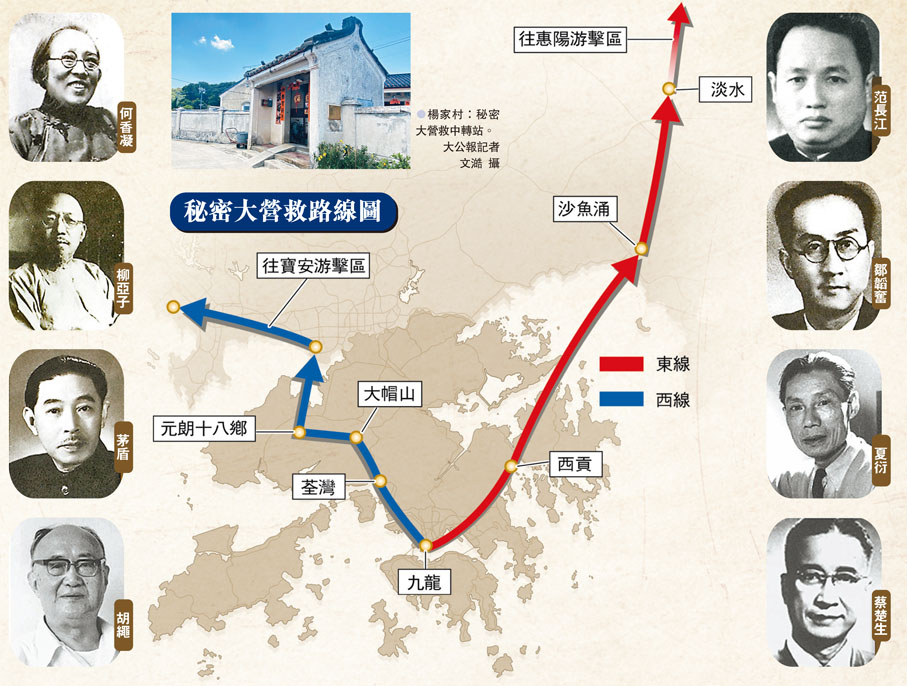香港淪陷期間,由中國共產黨領導的東江縱隊展開空前絕後的「秘密大營救」,在日寇嚴密封鎖下,將何香凝、鄒韜奮、茅盾、梅蘭芳、蔡楚生等數百名文化人士營救出來,轉移往後方安全地帶,奇跡般地完成一場「最偉大的搶救工作」。元朗十八鄉楊家村的適廬,曾是這次大營救中極其重要的「中轉站」。當年親歷者、楊家村的後代楊永光現仍生活於此。楊永光日前接受大公報訪問時憶述,「楊家村村民從初始的警惕,到後來的為保護游擊隊員寧死不屈,是共產黨的熱忱感動了楊家人。」●大公報記者 劉越琦、常彧璠