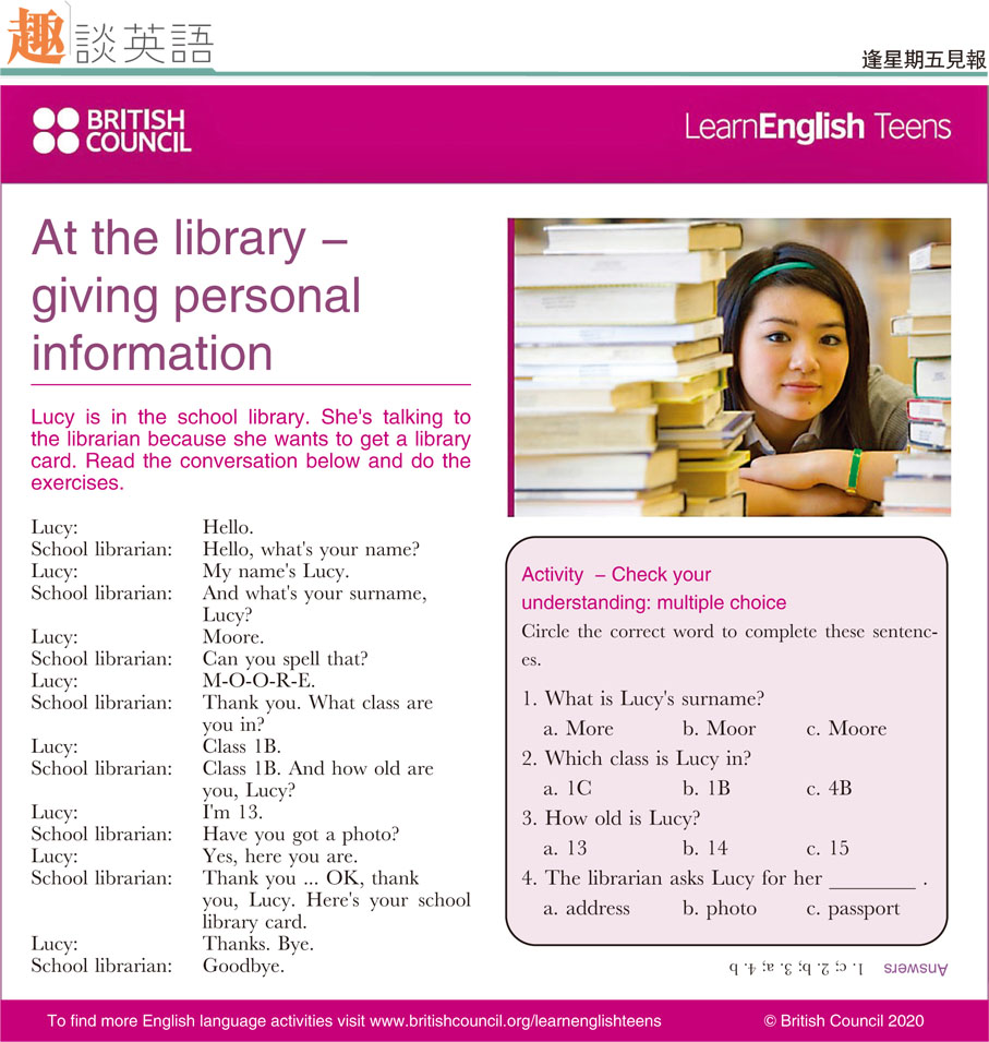 Lucy is in the school library. She's talking to the librarian because she wants to get a library card. Read the conversation below and do the exercises.