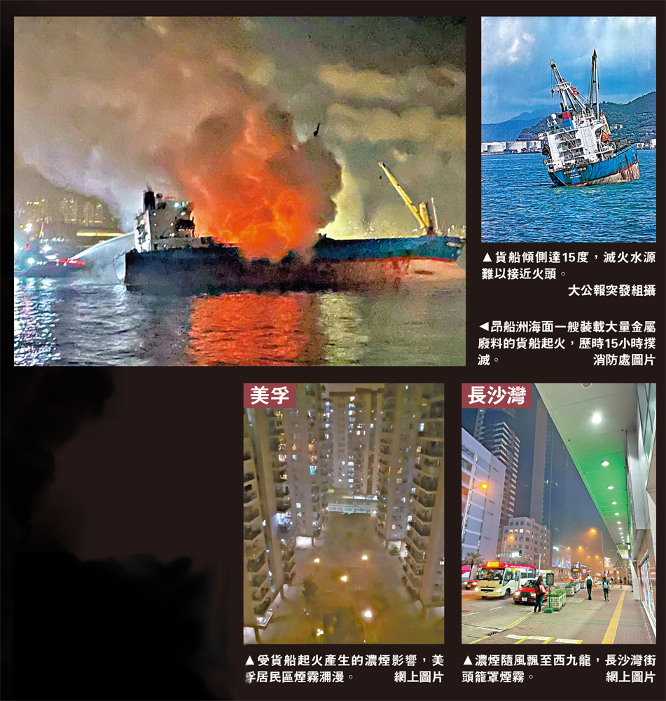 (大公報記者 黃浩輝)昂船洲海面發生長命火,載有金屬廢料的貨船前晚起火,濃煙籠罩西九龍多區,攻入深水埗至葵涌一帶民居。毒煙滲着濃烈燒膠氣味,大批居民投訴嗆鼻刺眼,有人家中的寵物更吸入「毒煙」嘔吐,多區懸浮粒子量飆升。