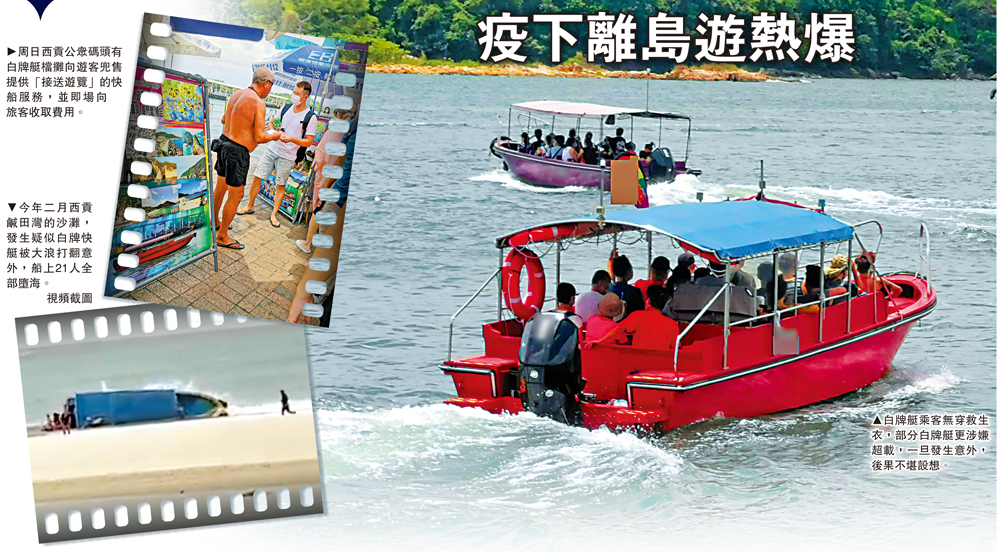 (大公報記者 盛德文、黃山)白牌艇水上飛,乘客隨時樂極生悲!疫下港人無處可去,離島遊成為假期的熱門「放風」活動。每逢假日,往離島玩樂的市民擠滿西貢碼頭,非法載客的「白牌艇」船船爆滿,存在嚴重的安全隱患。今年2月20日西貢鹹田灣發生疑似白牌艇被大浪打翻意外,21名乘客墮海幸獲救,事件為白牌艇問題敲響警號。大公報記者上周日(30日)在西貢碼頭直擊一艘艘載着遊客的白牌艇,無視海事處的監管船,不停地高速穿梭於離島和碼頭間;不少遊人疑在不知情下誤上白牌艇,有遊人搭完高速白牌艇上岸後直呼「好驚!以後都唔敢再搭了。」