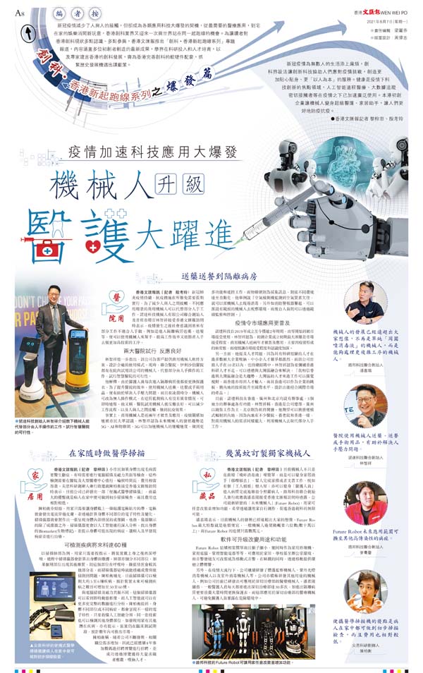 林智祥進一步指出,該公司為客戶提供商用機械人軟件方案,設計合適的使用模式。現時,聯合醫院、伊利沙伯醫院都有在院內試用該公司的機械人,代替部分由人手操作的工作,試行智慧醫院的可行性。