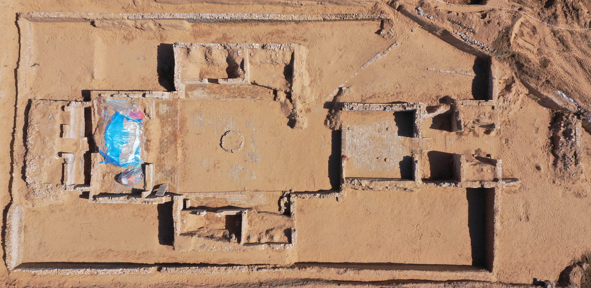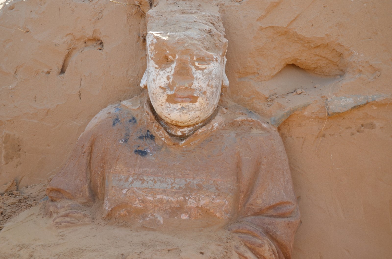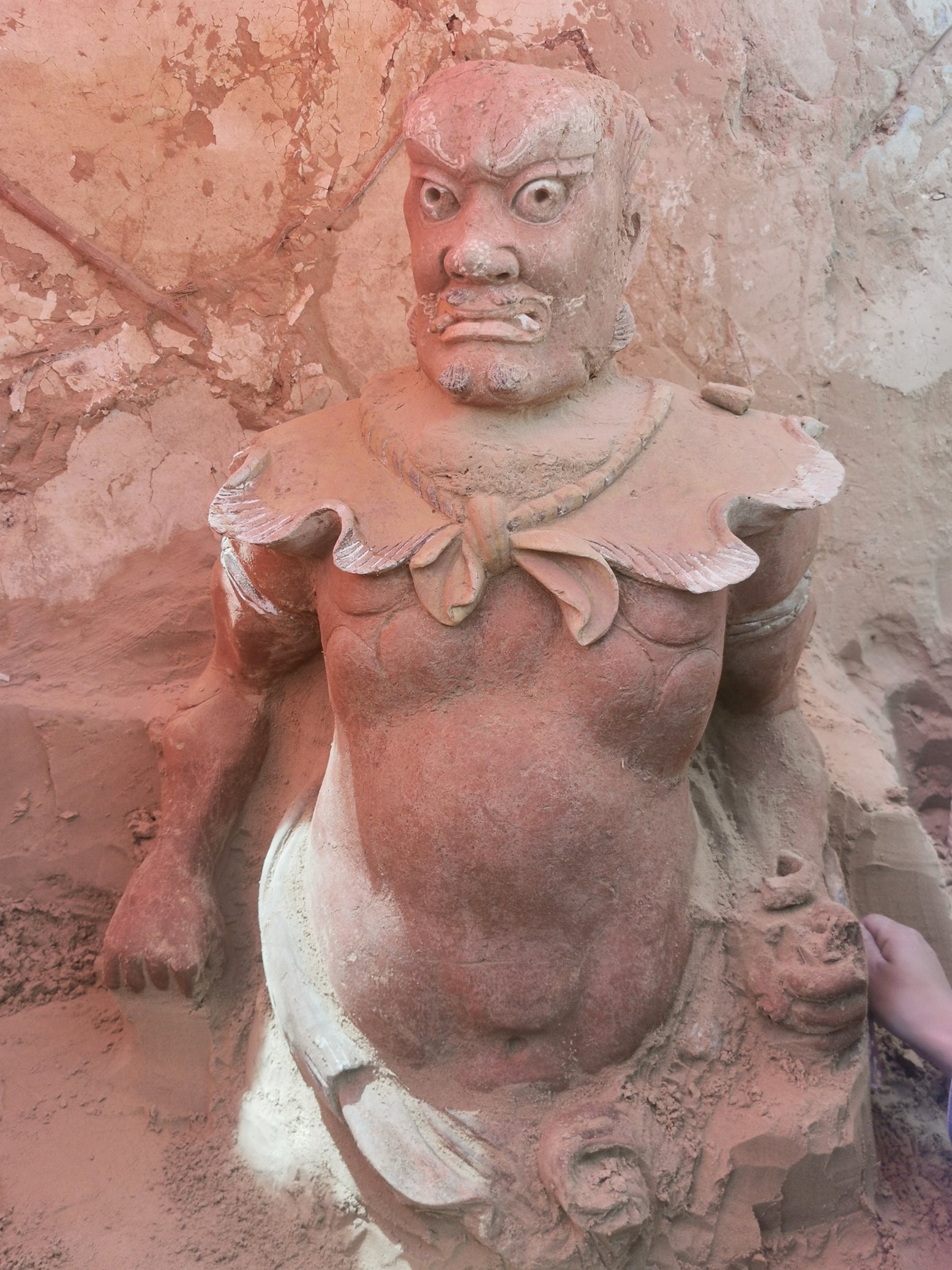 「我們在發掘中發現大批建築遺跡,分屬兩個院落。其中南側院落規模較大,南北長約60米,東西長約25米,有保存完好的院牆、房屋、磚鋪地面等。」據陝西省考古研究院副研究員于春雷介紹,根據該院落內出土的一塊石碑碑文記載,此院落名為顯應宮,是一座城隍廟,嘉靖年間曾重修,後於萬曆年間由延綏副總兵杜松集資再次重修。顯應宮由院牆、照壁、門廳、戲台、東西側殿、大殿及寢宮等部分組成,這批建築房屋頂部已經坍塌,但是牆壁保存較好。「值得一提的是,除戲台外,我們在其餘建築內均發現有保存完好的彩繪泥塑造像,目前共發現造像30餘尊。」于春雷表示,這批造像接近真人大小,顏色鮮艷,造型栩栩如生,展現出了極高的藝術水準,且造像數目較大,保存完好。根據造像外形判斷,目前揭露的數尊均為城隍、判官、夜叉小鬼等形象,與碑文記載相符。