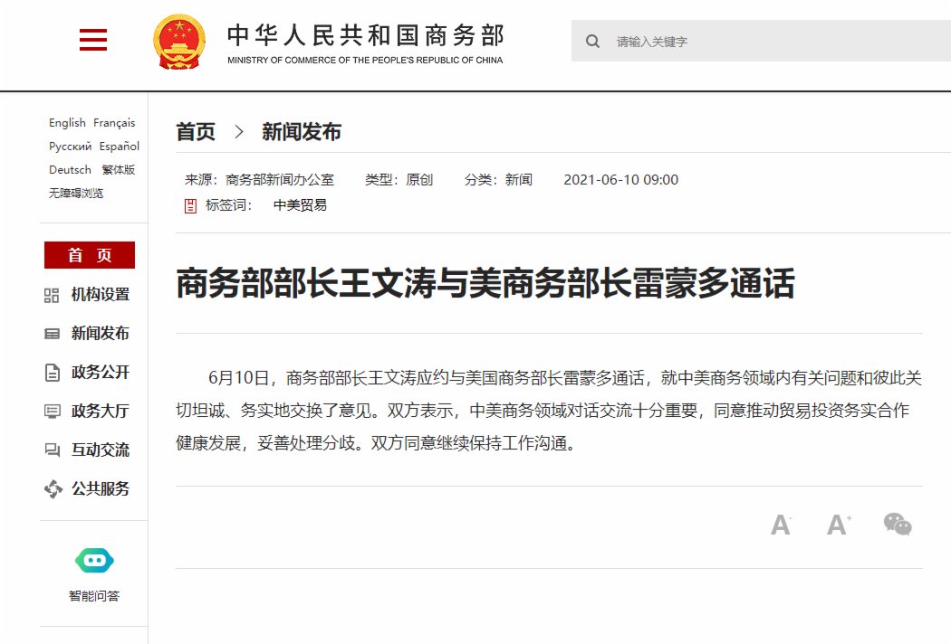 據中國商務部10日消息,商務部部長王文濤當天應約與美國商務部長雷蒙多通話,雙方同意推動貿易投資務實合作健康發展,妥善處理分歧。