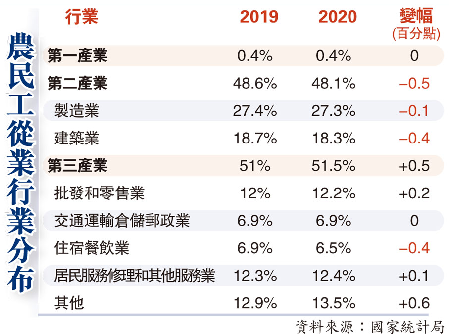 農民工是中國建築業的主力軍,但近年這一行業出現了用工荒。據國家統計局《2020年農民工監測調查報告》,2020年全國農民工總量28,560萬人,其中5,226.48萬人從事建築業,佔比18.3%,較2019年下降0.4個百分點。一方面,施工企業招工難,另一方面,農民工找不到工作的現象也屢見不鮮。最近陝西有從事建築業的國企探索勞務產業轉型升級,成立勞務公司統一調配安排,解決用工問題的同時,也使農民工工作和薪酬有保障。公司正吸納社會勞務資源進行混改,並計劃進行產業鏈的延伸。●香港文匯報記者 張仕珍 西安報道