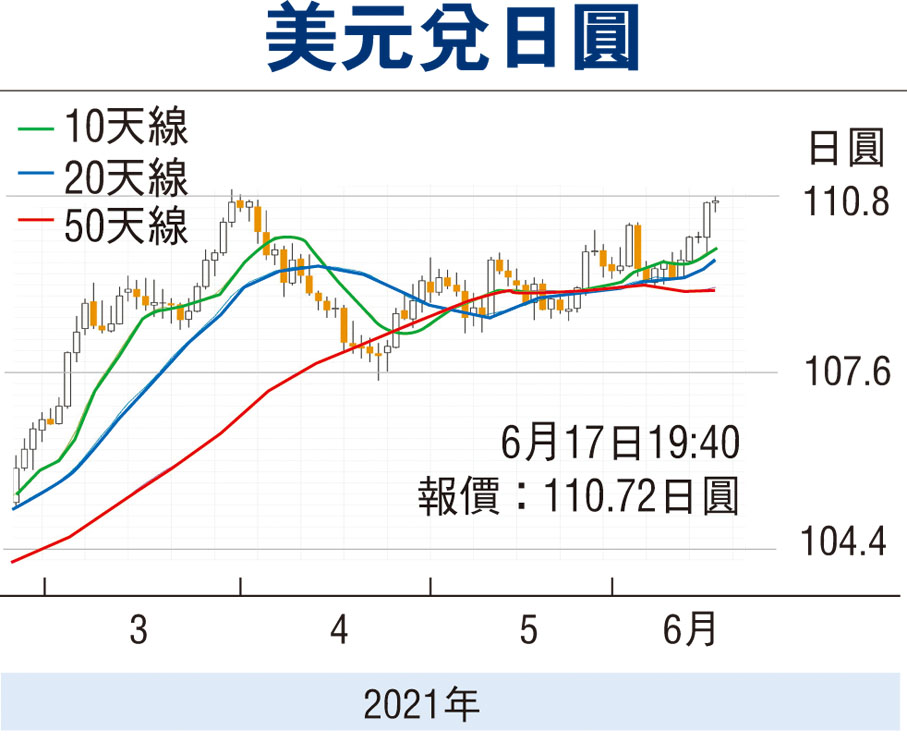 美元兌日圓本周初在109.60水平獲得較大支持,走勢偏強,周三升幅擴大,周四曾走高至110.80水平11周高位。美國5月份的消費者物價指數與生產者物價指數雙雙顯著攀升,顯示通脹升勢加劇,美國聯儲局立即在本周會議上偏向提早在2023年作出兩次加息行動,反映聯儲局的政策已偏向壓抑通脹,立場較前轉鷹,部分投資者掉頭回補美元空倉。隨着聯儲局開始討論收緊其購債計劃,不排除將在7月27日至28日連續兩天的會議上推出較具體的緊縮內容,而聯儲局較市場預期為鷹的立場迅速帶動美國10年期長債息率連日向上觸及1.594%水平近兩周高點,支持美元兌日圓徘徊110水平。