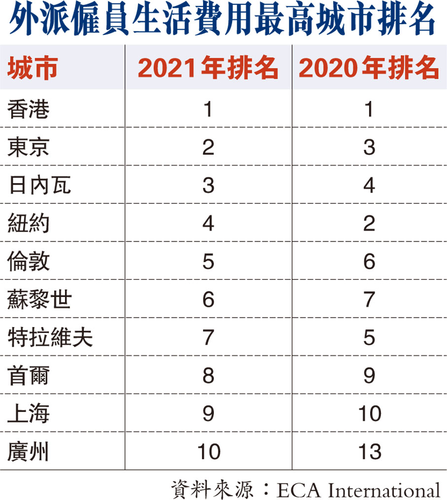 ECA International亞洲區域總監關禮廉表示,雖然本港租金下跌,匯率亦趨疲弱,但香港仍是全球外派僱員生活費用最高城市。「儘管與歐元及人民幣等多個主要貨幣相比,港元在過去12個月的表現相對走弱,但紐約也面對相似情況,其排名由第2位下降至第4位,香港則仍名列榜首。」