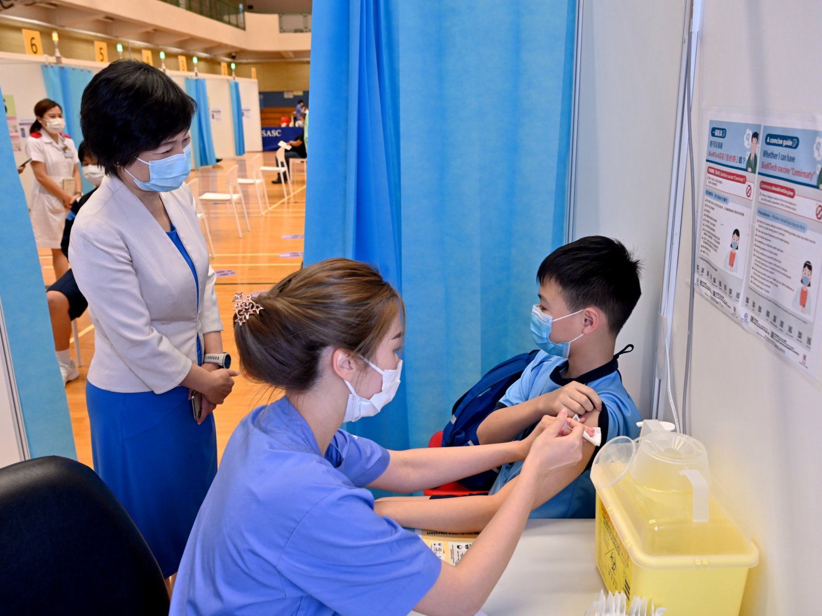 大公文匯全媒體報道:粉嶺官立小學20多名學生、教職員和學生家長今日(21日)下午透過團體預約形式到龍琛路體育館社區疫苗接種中心,接種新冠疫苗。教育局副局長蔡若蓮博士亦到場視察疫苗接種情況。有學生表示打針後感到開心,而學校老師亦曾宣傳打針的好處,認為打針可以保護自己及家人,會呼籲其他同學接種。