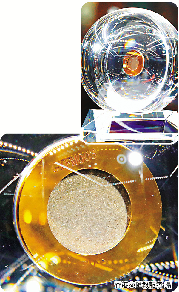 淨重約2克的月壤是此次展品中的重頭戲,包含微細的礦物顆粒、岩石碎屑和玻璃質微粒等,主要由氧(O)、矽(Si)、鋁(AI)、鐵(Fe)、鎂(Mg)、鈣(Ca)、鈉(Na)、鉀(K)、鈦(Ti)等元素構成,不含有機養分,而且非常乾燥。「月壤不能種菜」詞條曾登上微博熱搜。