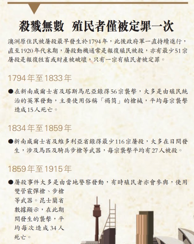 澳洲《衛報》此前根據澳洲紐卡素大學21世紀人類中心的殖民屠殺數據,整理出澳洲原住民大屠殺數字,發現從1794年起當地發生過最少270宗原住民大屠殺,部分更有政府武裝部隊參與,情況持續至最少1920年代,而且時間愈後,死亡人數愈多,涉及騎兵步槍、雙管霰彈槍等不同武器,動機大多是報復殖民者平民被殺,或有牲畜及財產被偷或破壞等。