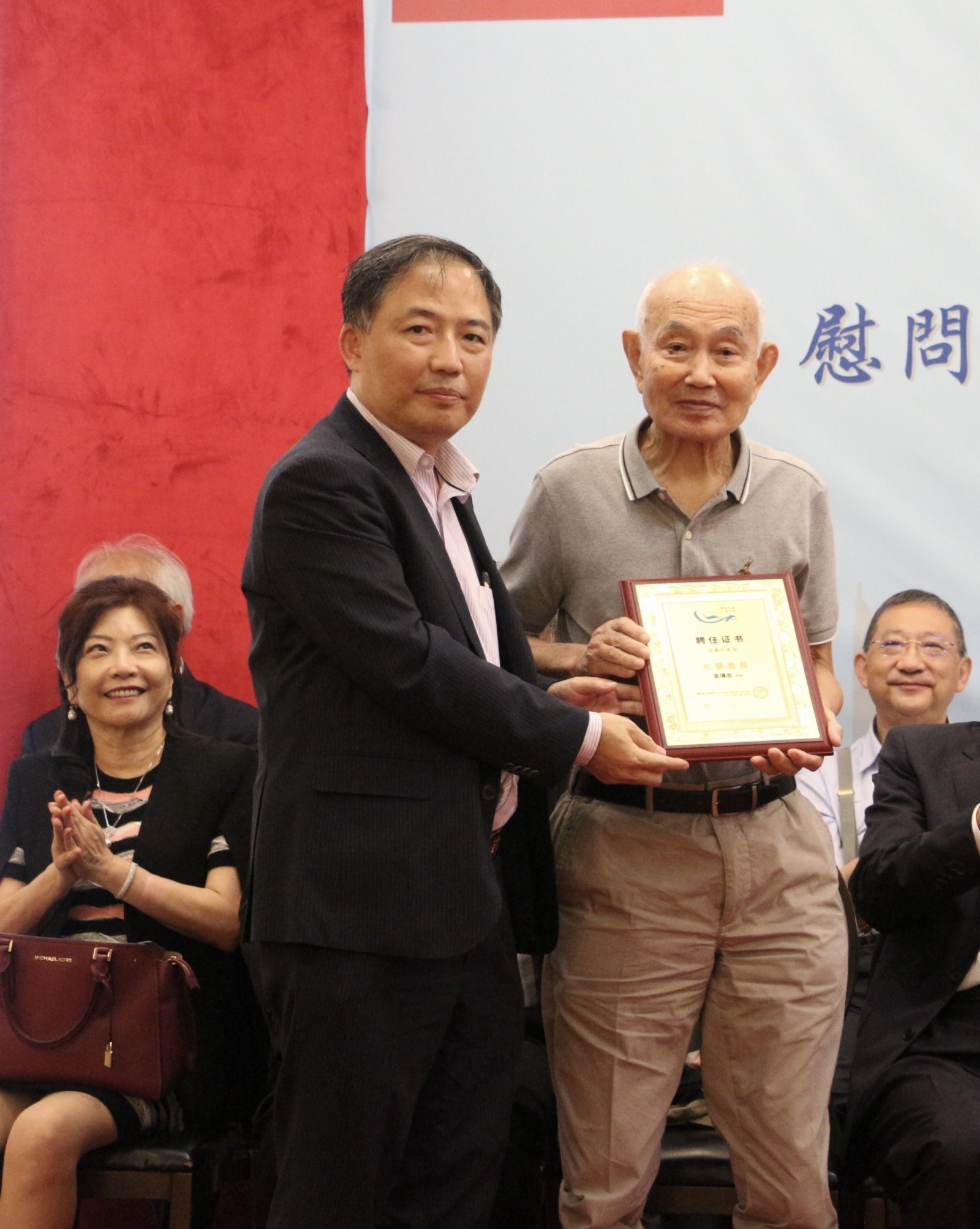 威海衛警察在港服務已有四代,第二代警察代表、前員佐級警察會會長吳傳忠老先生被授予香港威海同鄉會榮譽會長;第三代、第四代警察代表也分別發表了感言。