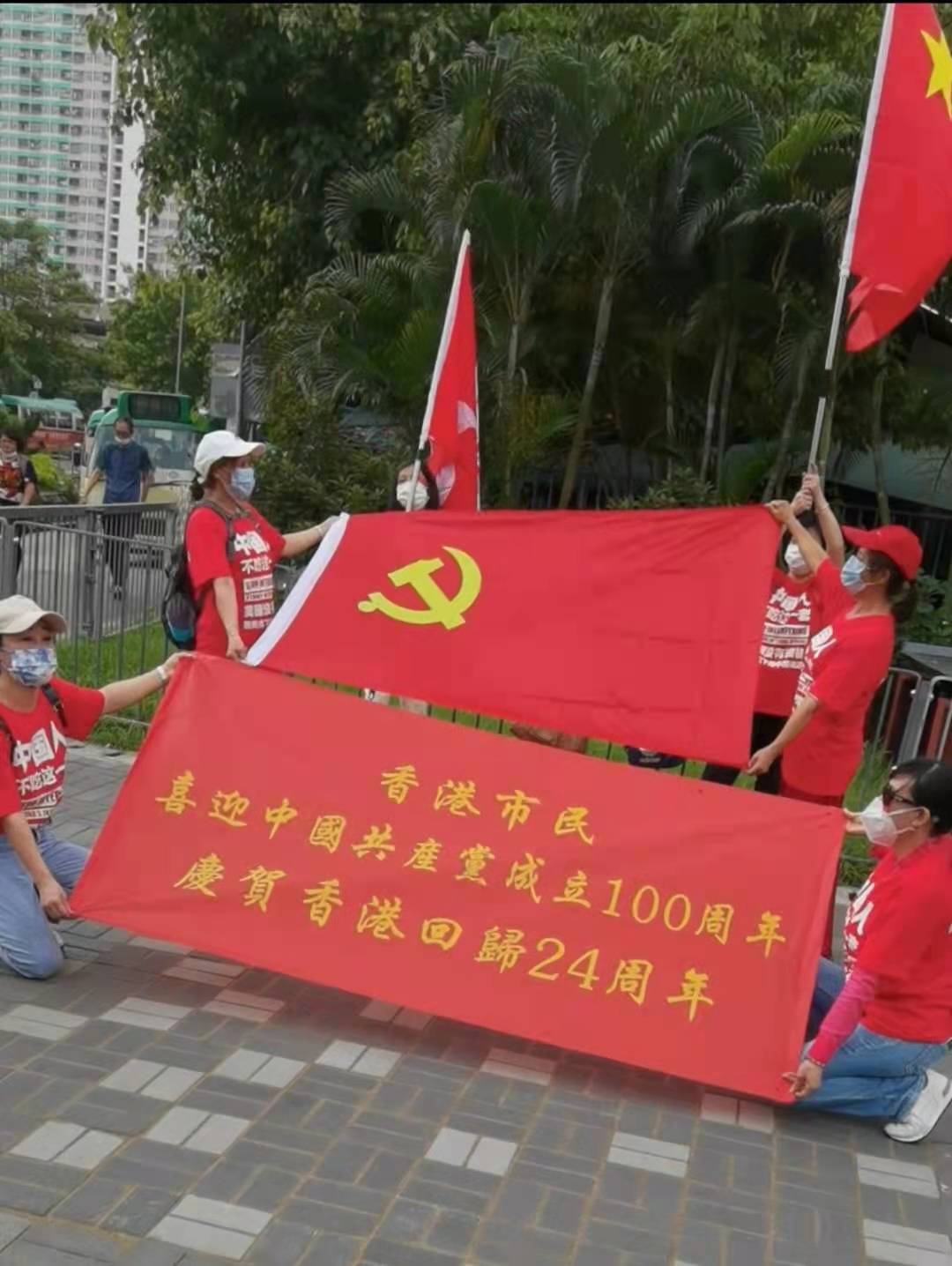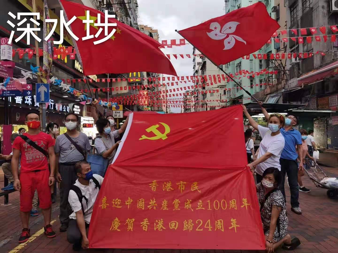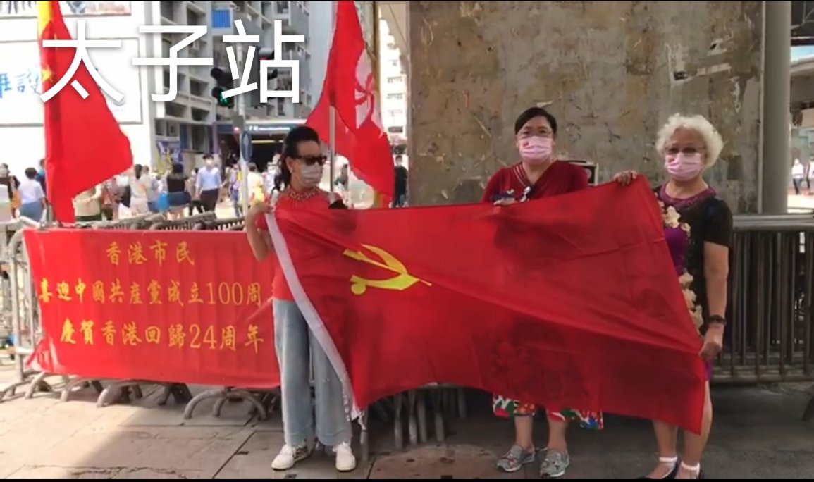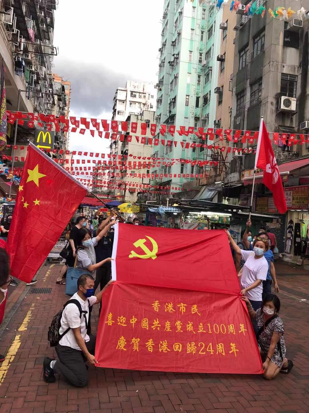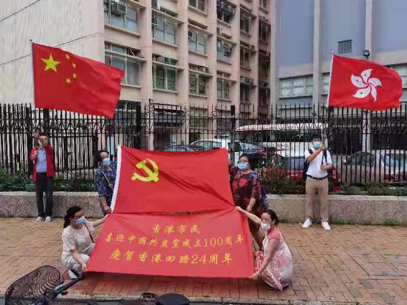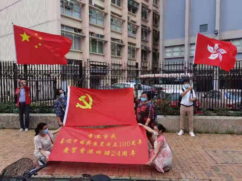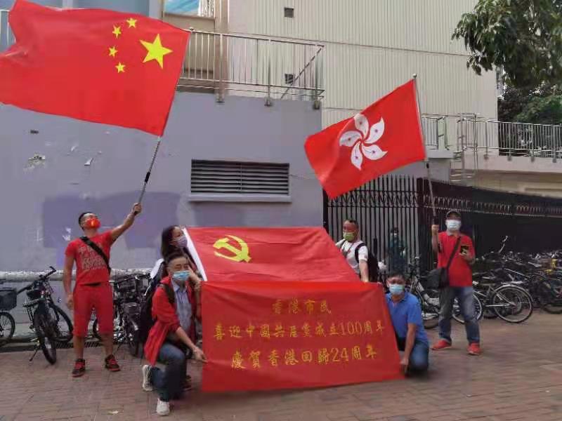 今日是中國共產黨成立100周年,也是香港回歸祖國24周年,眾多香港市民近兩日在全港十八區主要街道路口,揮舞國旗和香港特別行政區區旗,高唱國歌,表達慶祝。