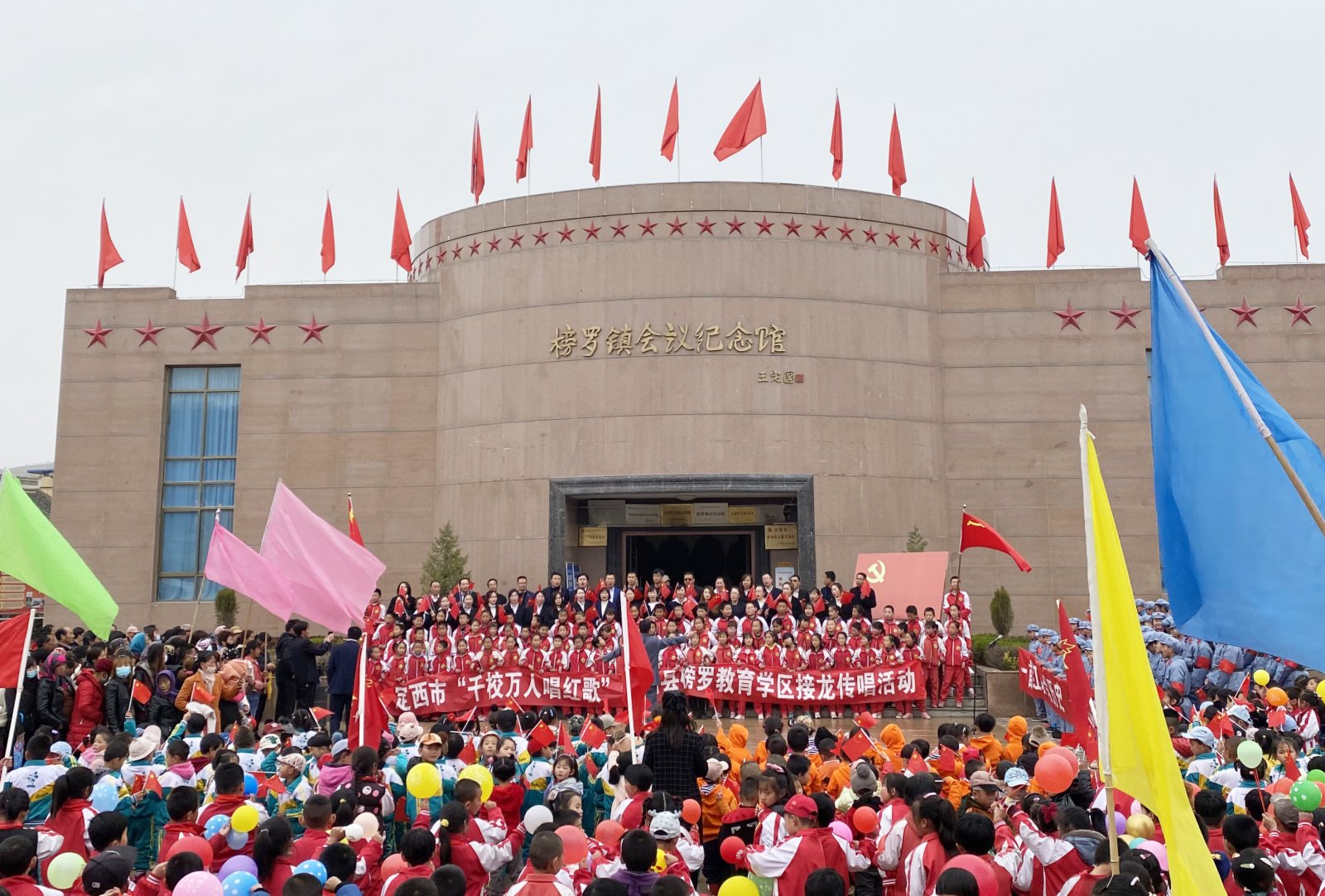 一首紅歌,訴說百年征程波瀾壯闊;一首紅歌,見證百年初心歷久彌堅。在紅色革命歷史傳承百年老校——通渭縣文廟街小學,1800名師生手執黨旗,激情飽滿,放聲歌唱《唱支山歌給黨聽》《我和我的祖國》等紅色歌曲,引來周邊市民紛紛駐足觀看,並積极參与到紅歌傳唱活動中,將活動推向高潮;通渭縣榜羅學區1100多名師生齊聚中共中央政治局榜羅鎮會議紀念館前,手執條幅和黨旗,齊唱《沒有共產黨就沒有新中國》《黨啊,親愛的媽媽》,並向身邊群眾講述黨史故事,傳遞紅色精神……活動啟動2個月以來,師生們用嘹亮的歌聲、充沛的情感,唱響了「沒有共產黨就沒有新中國」的主旋律,點燃了熱愛祖國、熱愛中國共產黨的激情,慷慨激昂的歌聲在校園內外久久回蕩。