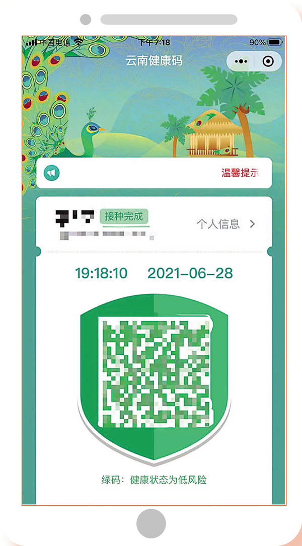 新版的雲南健康碼在5月11日更新上線後,背景就變成了一隻美麗的孔雀,當完成了疫苗一次注射、二次接種後,健康碼底部的盾牌也會隨之變換顏色。
