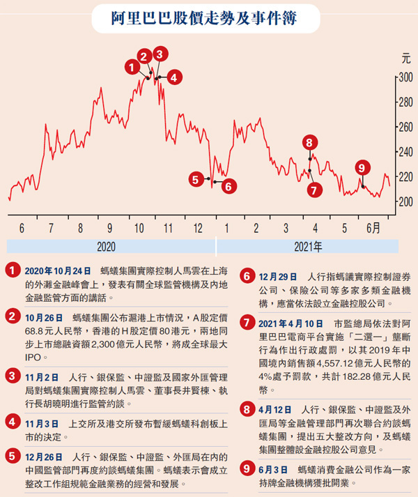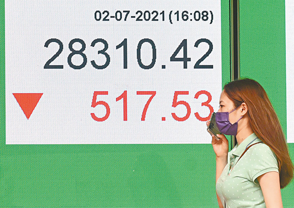 (香港文匯報記者 周紹基)港股下半年開局大挫逾500點。據外媒消息,阿里巴巴(9988)創辦人馬雲及副主席蔡崇信,已將他們在阿里巴巴合計350億美元(約2,700億元)股份中的一大部分持股,抵押予投資銀行以取得大量貸款。加上昨日內地再就電商平台的價格違法,出台處罰規定的徵求意見稿,最高罰上年銷售額10%,情節嚴重須停業整頓或吊銷營業執照。消息令阿里、美團(3690)及京東(9618)等平台型公司的股價受壓,其中阿里急跌3.6%,收報212元。