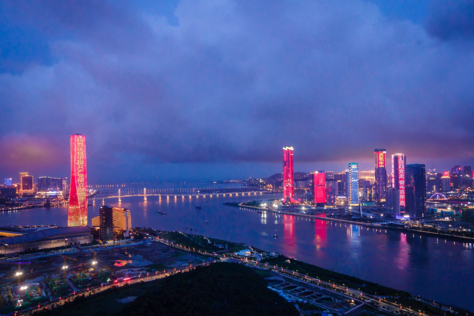 據橫琴新區管委會透露,一場主題為「百年風華,蓮開盛世」的光影秀,以澳門標誌性建築中國銀行大廈為幕布日前上演,通過光影藝術呈現了南湖紅船、延安寶塔山、天安門以及大三巴、盛世蓮花、澳門旅遊塔、港珠澳大橋等地標,展現了建黨百年的光輝歷程和「一國兩制」下澳門與祖國內地同發展、共繁榮的美好願景。濠江對岸的橫琴,在高空俯瞰下燈火輝煌,一棟棟高樓在夜色中流光溢彩,描畫出橫琴的天際線。
