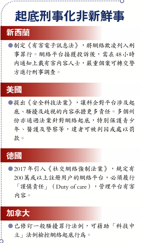 香港特區政府計劃修訂《個人資料(私隱)條例》,將「起底」行為刑事化,據《華爾街日報》報道,facebook(fb)、twitter及Google母公司Alphabet等科企早前致函特區政府,稱若修例通過,將可能停止在香港提供服務。事實上,立法打擊「起底」並非香港獨有,全球多國近年都採取措施打擊相關行為,部分國家的法案或法律,更會明確要求大型社交網站對平台內容負責,包括在限期內移除有害內容,打擊仇恨言論及網絡欺凌行為,違者將面臨巨額罰款,嚴重者更可被禁止營運。 ●香港文匯報記者林文佑