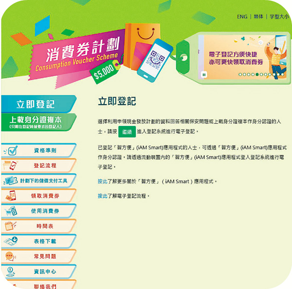 香港文匯報訊(記者 文森)5,000元電子消費券計劃截至昨晨8時,有超過320萬人經網上申請,當中超過270萬人選擇以去年派發1萬元現金計劃的資料進行登記,另有40萬人上載身份證副本申請,10萬人用「智方便」認證身份。為改善「智方便」網上登記出現「塞車」情況,特區政府昨日凌晨3時起更改登記網站設計,選用「智方便」市民須直接透過有關流動應用程式登記,本身有「智方便」賬戶才可登入。