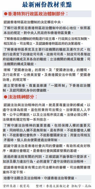 香港文匯報記者昨日取得該兩份教材。在香港特區政治體制的部分,透過今年3月全國人大行使權力作出《 關於完善香港特別行政區選舉制度的決定》,引導學生理解香港特區政治體制的決定權在中央,以及香港特區直轄於中央人民政府、是國家的一個地方行政區域,香港特區的高度自治權是中央授予等背景。