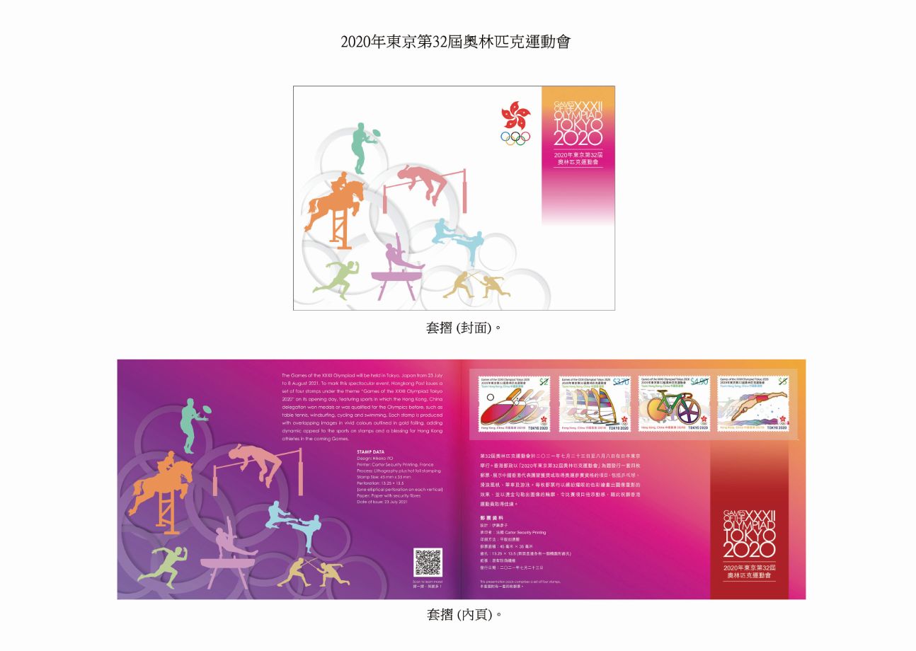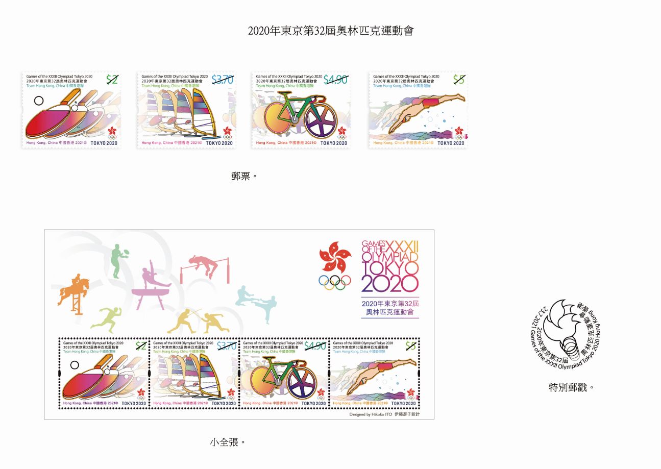 香港郵政指,是次發行一套4枚的特別郵票,分別展示中國香港代表團曾獲獎或取得奧運會參賽資格的項目,包括乒乓球、滑浪風帆、單車及游泳,每枚郵票以繽紛耀眼的色彩營造圖像重影的效果,並以燙金勾勒出圖像的輪廓,令郵票上的比賽項目倍添動感。